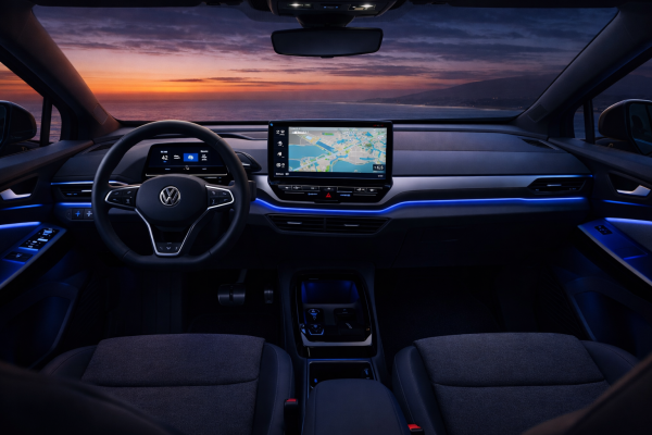 در داخل، فولکس واگن آی دی فور فلسفه “Less is more” را به خوبی اجرا کرده است. فضای داخلی با ادغام فناوری و مینیمالیسم طراحی شده تا راننده و سرنشینان بدون حواس پرتی از رانندگی لذت ببرند. نمایشگر مرکزی ۱۲ اینچی لمسی، کنسول شناور و نورپردازی محیطی قابل تنظیم از ویژگی هایی هستند که حس لوکس بودن را افزایش می دهند.